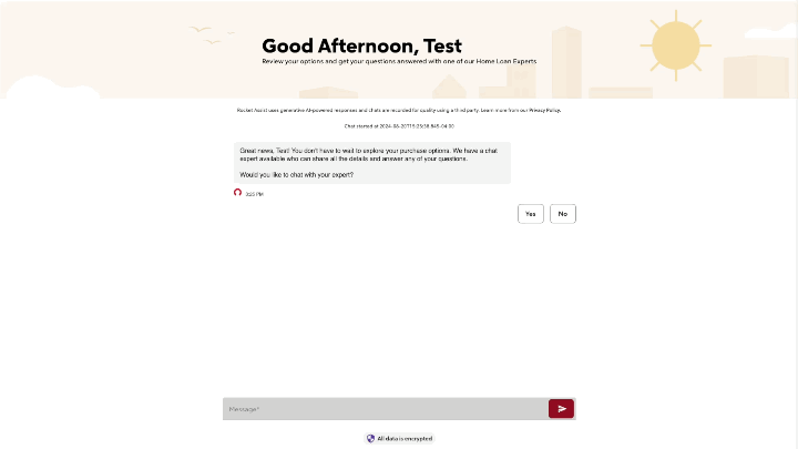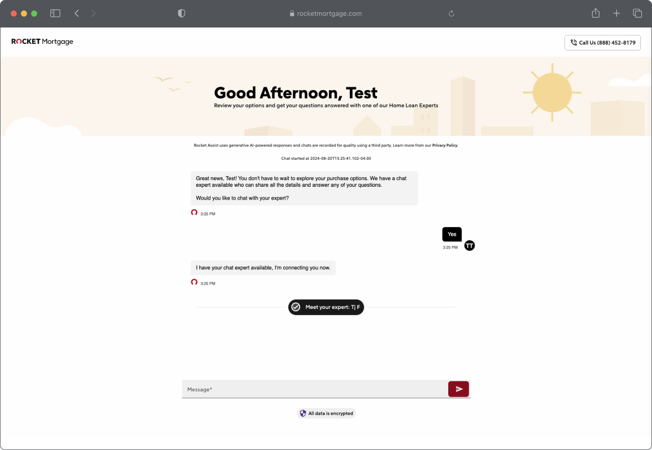 I created a full-screen/full-browser conversational UI that enabled clients to chat with our conversational AI and mortgage bankers. The experience integrated with Salesforce for mortgage banker chats so that our users had one seamless experience. We also added light personalization by leveraging client info gathered from the lead form including their name, property type, and local time of day.