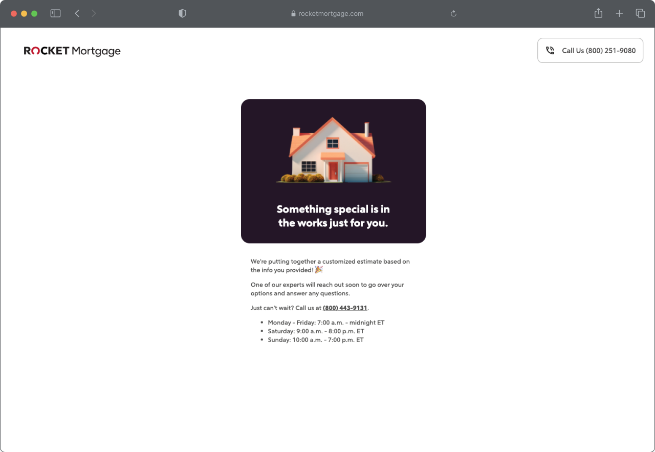 Every Rocket Mortgage client starts in the same place, filling out a digital lead form then talking with a mortgage banker. The lead form, however, ends at a frustrating dead end while the client unexpectedly receives a phone call. The hypothesis is this experience was the primary driver for low top-of-funnel success rates. The challenge was to measurably improve the lead form experience without negatively impacting lead flow.
